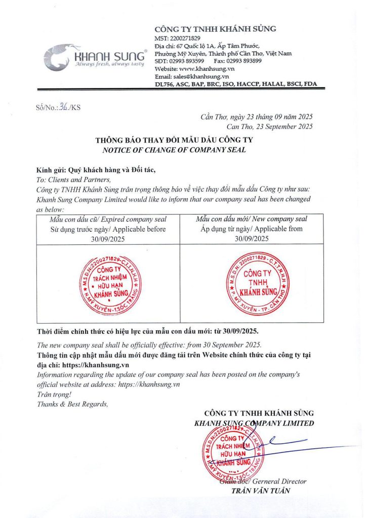 Khanh Sung Company Limited would like to inform that our company seal has been changed as below: